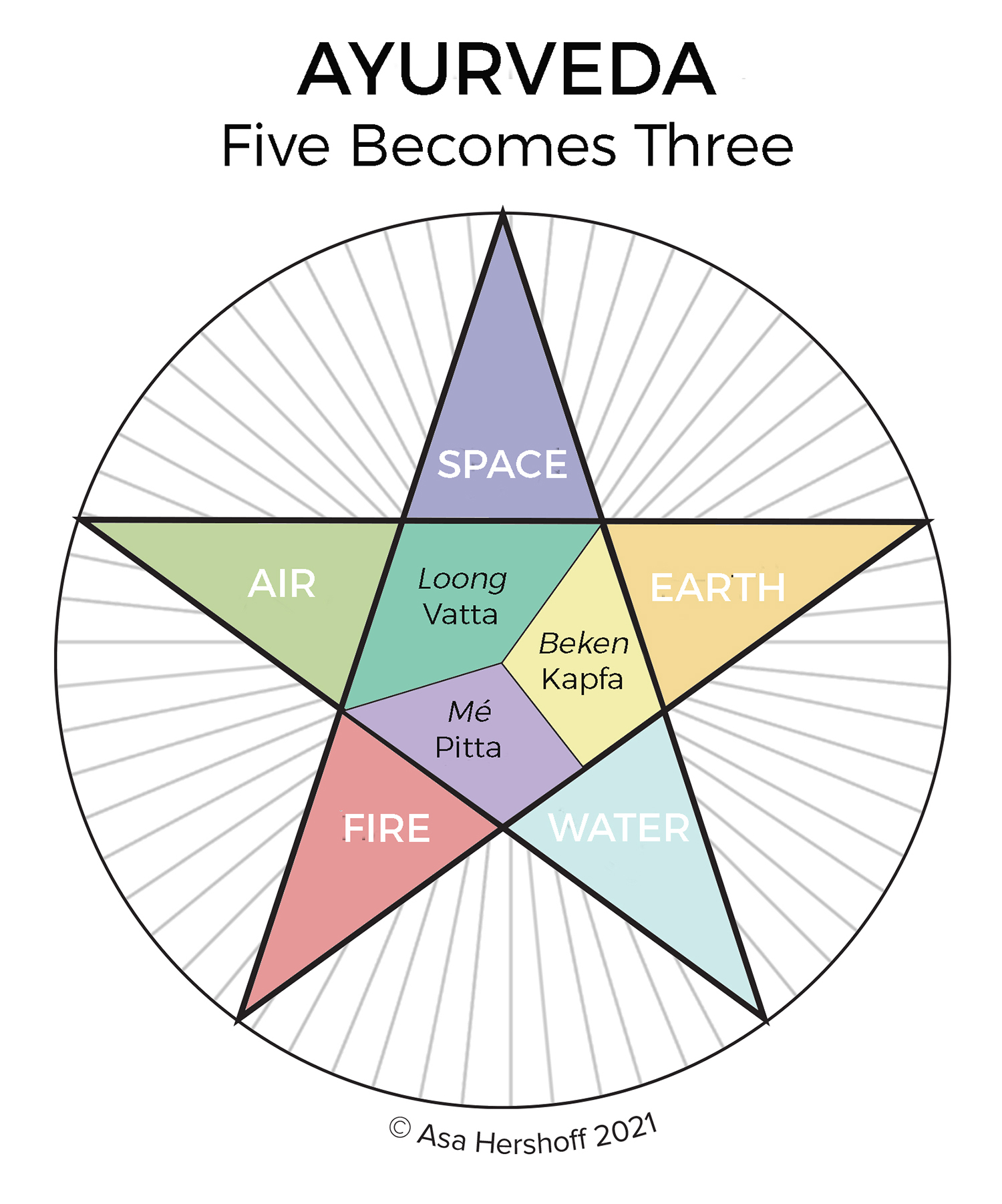 Ancient Ayurvedic science was transplanted to Tibet, augmented by revealed teachings, including the Yutok medical system. Ayurveda is based on the five elements, which are parallel to the five Buddha families. People, diseases and medicines are classified according to their elemental properties. This includes body types and temperaments. Unfortunately we are limited by the traditional dosha system, which (inexplicably) compacts the five elements into a more convenient three modes. This same truncated system was to form the basis of Tibetan medicine. Apparently though, a pure 5-element system did exist as Buddhist Ayurveda which arrived in Thailand intact, though as Indian Ayurveda took root during modern times it is now only known to a few. Nevertheless, the body types of Fire (Skt: pitta Tib: may), Air (Skt: vatta Tib: loong) and Water (Skt: kapha Tib: beken) give us a good start in understanding our Elemental body constitution-and its Buddha family allocation.